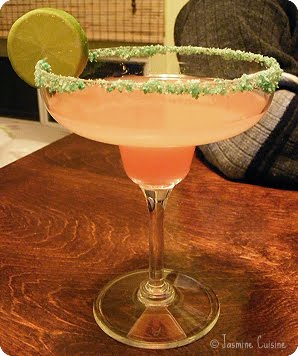 Mouiller le rebord d'un verre à margarita avec un quartier de lime. Verser du sel dans une assiette plate (j'ai mis du colorant alimentaire vert dans le sel, pour l'effet). Tremper le rebord du verre dans le sel, secouer pour enlever l'excédent.