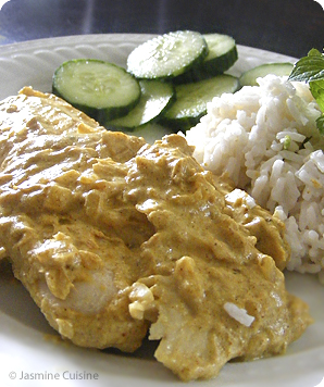 Pour accompagner ce poisson, je vous suggère un riz au jasmin ou un riz basmati, dont la saveur douce atténuera le piquant de la sauce. Les non-initiés en cuisine indienne l'apprécierons : ) De mon côté, j'ai fais cuire mon riz dans le lait de coco à la place de l'eau, et j'ai adoré le résultat : un riz à saveur de noix délicate s'harmonisant parfaitement bien avec le repas. Même mon copain, qui n'aime pas le poisson, a beaucoup apprécié. C'est tout dire!